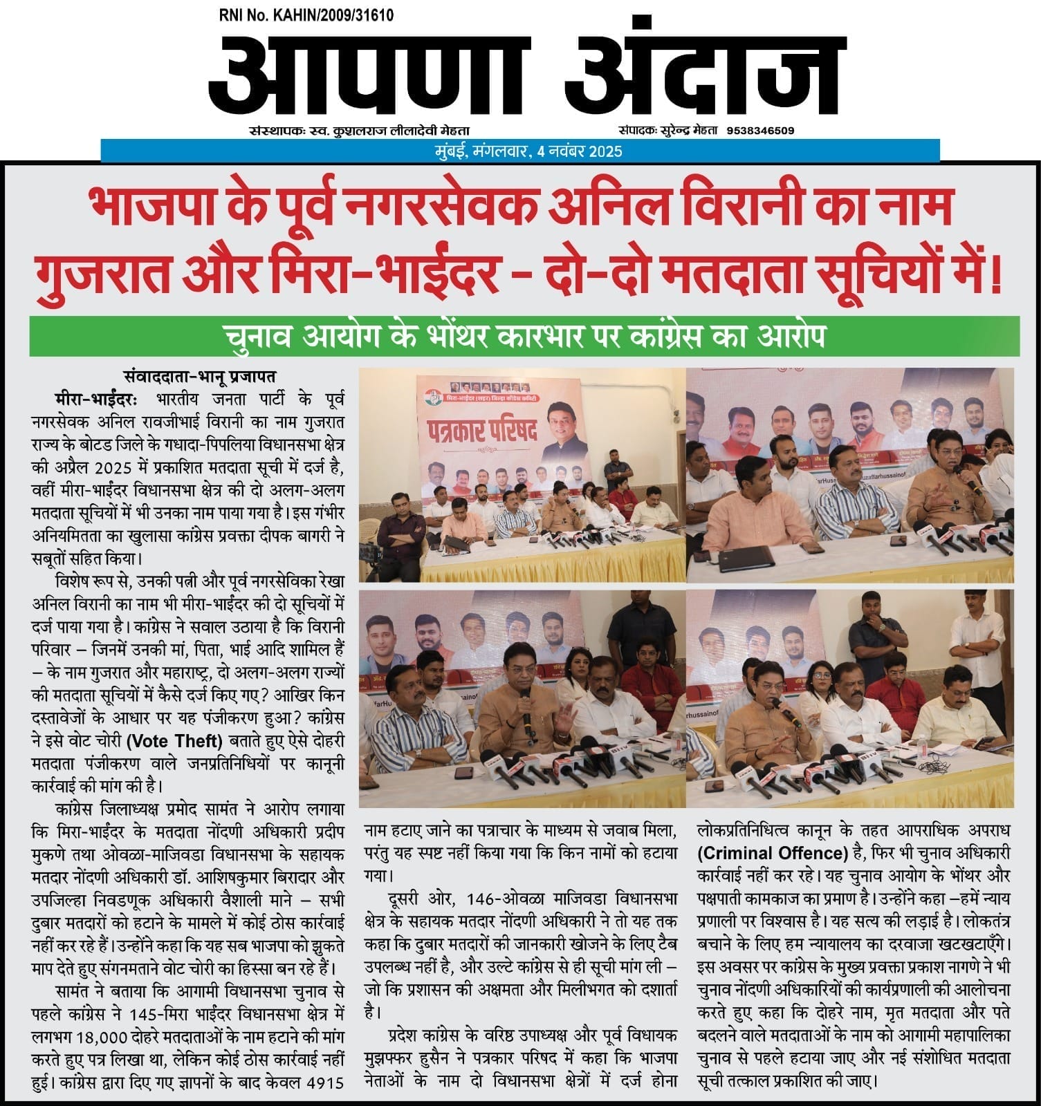भाजपा के पूर्व नगरसेवक अनिल विरानी का नाम गुजरात और मिरा-भाईंदर दो-दो मतदाता सूचियों में!