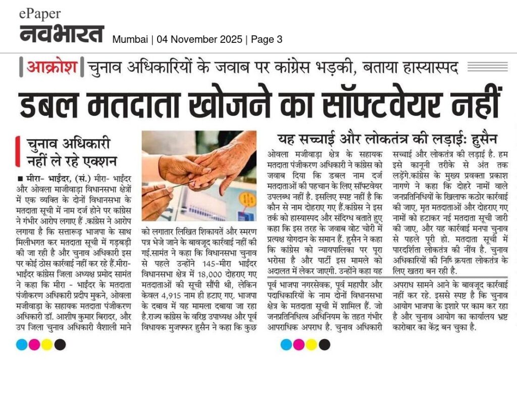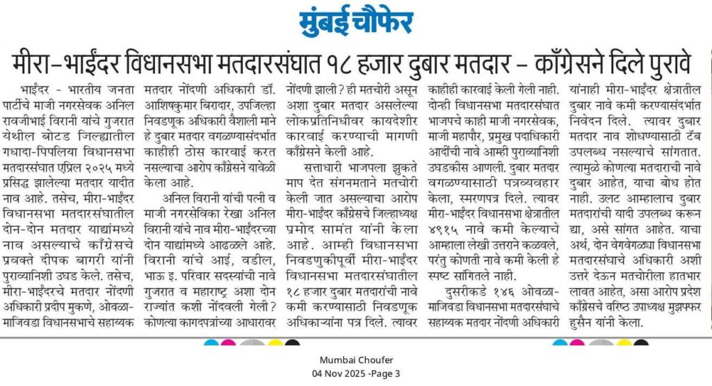 मीरा-भाईंदर विधानसभा मतदारसंघात १८ हजार दुबार मतदार – काँग्रेसने दिले पुरावे