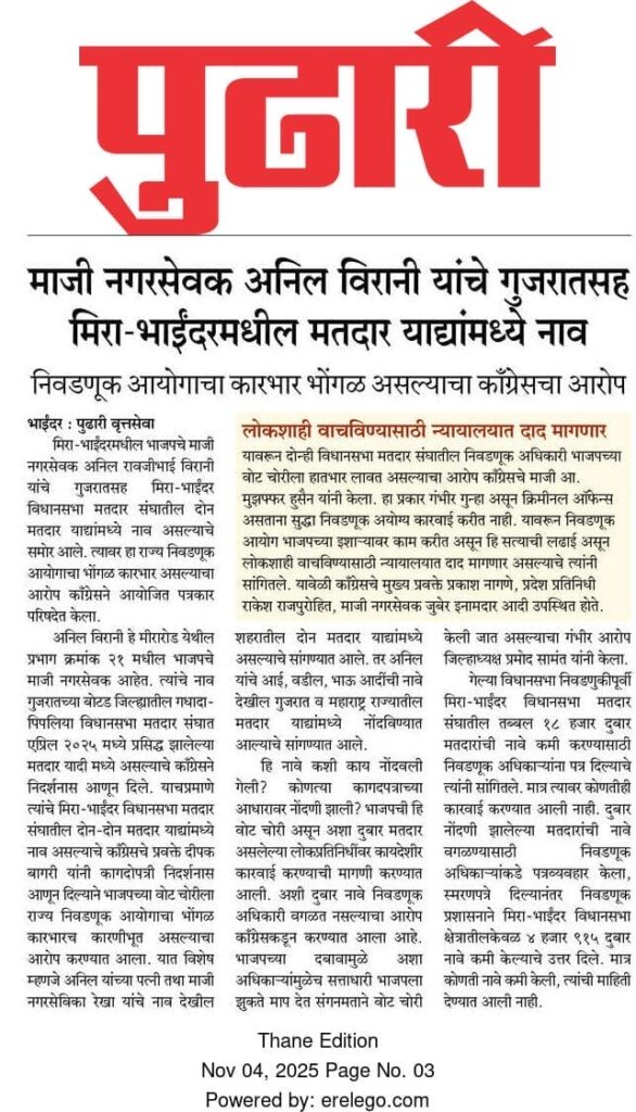 بی جے پی کے سابق کارپوریٹرائل ویرانی کا نام گجرات کے ساتھ میرا، بھائندر کی دو دو ووٹرلسٹوں میں، الیکشن کمیشن کی ناقص کارکردگی بے نقاب