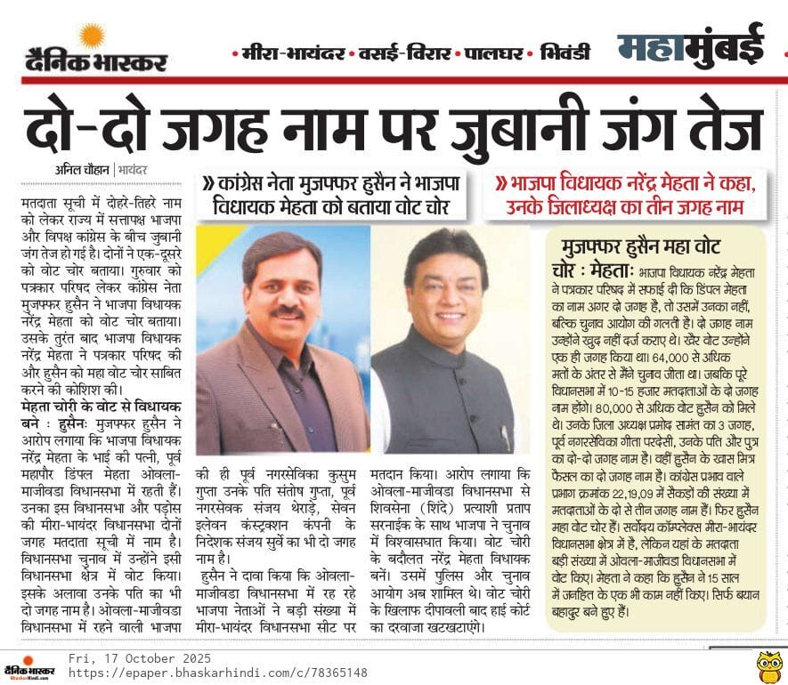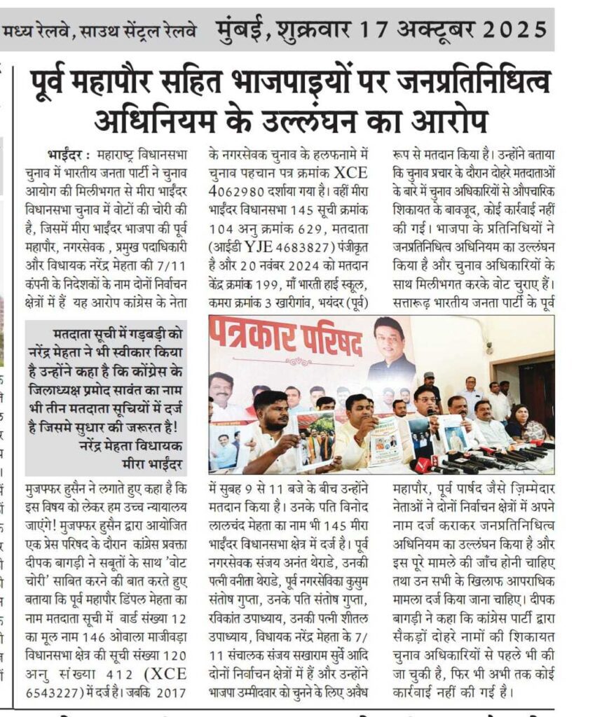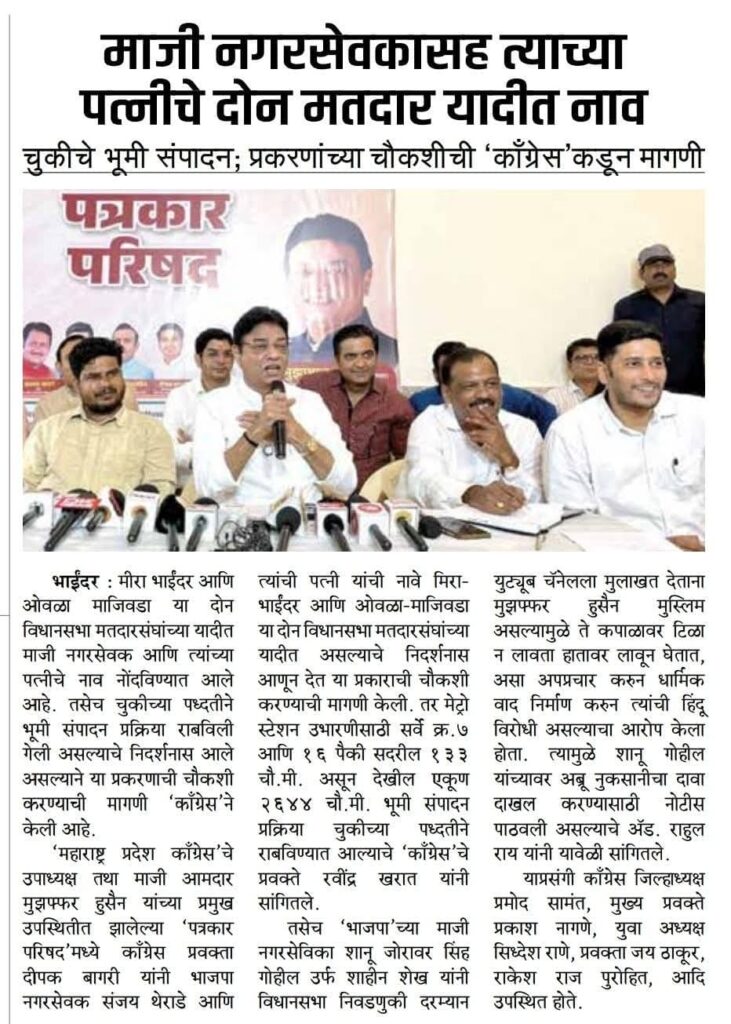 Latest News Home / News کانگریس لیڈر مظفر حسین نے ووٹ چوری کے دعوے کیلئے ثبوت پیش کئے Recent Post मेट्रो भूमी संपादन प्रक्रिया चुकीच्या पद्धतीने मंत्री नितेश राणे को मीरा-भायंदर युवक कांग्रेस का करारा जवाब मेट्रो – ९ के भूमि अधिग्रहण में घोटाला ! माजी नगरसेवकासह त्याच्या पत्नीचे दोन मतदार यादीत नाव नितेश राणे […]