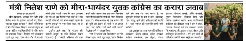 मंत्री नितेश राणे को मीरा-भायंदर युवक कांग्रेस का करारा जवाब
