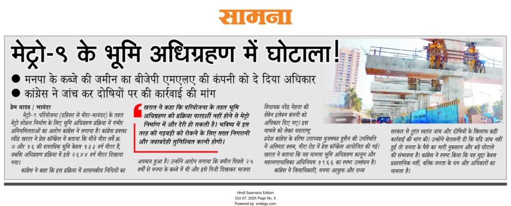 मेट्रो – ९ के भूमि अधिग्रहण में घोटाला !