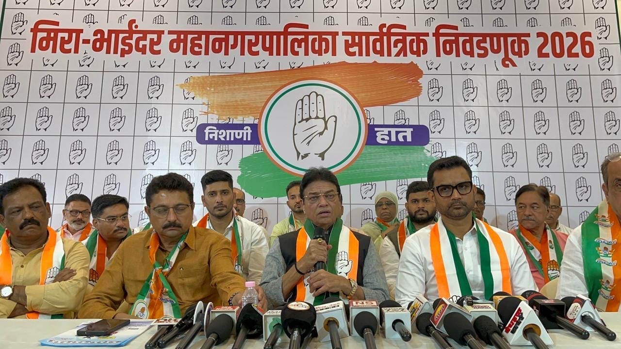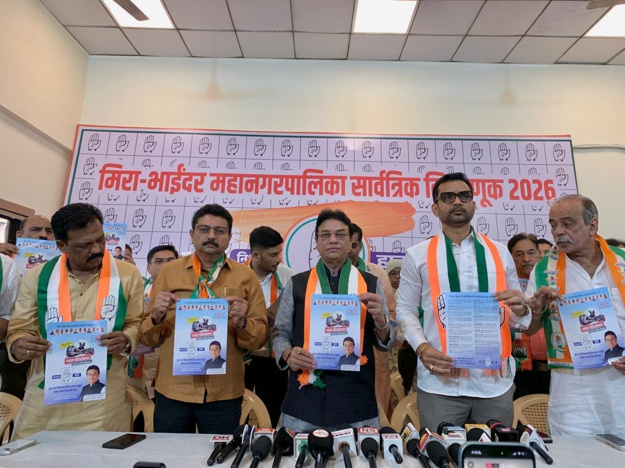 मिरा–भाईंदर महानगरपालिका निवडणूक 2026 च्या अनुषंगाने आयोजित पत्रकार परिषदेत शहराच्या सर्वांगीण विकासासाठी १७ सूत्रांचा जनहितकारी जाहीरनामा प्रसिद्ध करण्यात आला. यावेळी काँग्रेसच्या उमेदवारांना विजयी करून विकासाचा संकल्प करण्यात आला.
